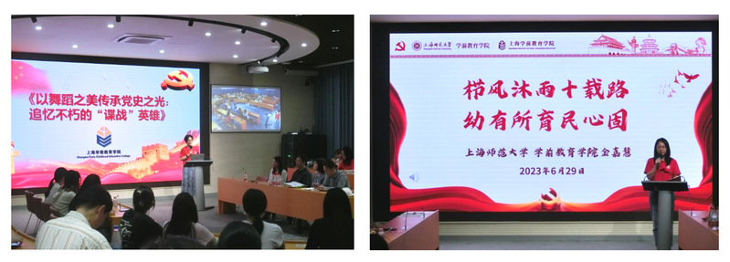 唐洁从中国共产党的初心和使命讲起,重点讲述了师大作为中华人民共和国成立后党为人民办教育的初心之地,担负为上海基础教育事业培养新师资重任的故事。随后,学院青年理论宣讲团成员吴珺老师和金嘉慧同学分别带来主题为《以舞蹈之美传承党史之光:追忆不朽的“谍战”英雄》和《栉风沐雨十载路,幼有所育民心固》的党课。吴珺结合舞剧《永不消逝的电波》与党员们一起重温了李白烈士的故事,向大家展示如何以舞蹈之美讲好烈士的故事。金嘉慧通过“十年能够做什么?”这一问题,引出我们要尽可能让更多孩子接受教育,呼吁全体学生党员要和时代同频共振,以自身所学,矢志不渝地践行为党育人、为国育才的崇高使命,助力中华民族伟大复兴。