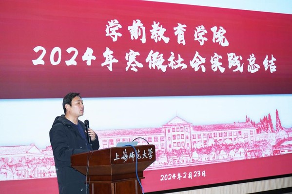 学院党委副书记周泽龙作2024年寒假社会实践总结汇报,包括爱心学校、社会调研、红色大寻访等多项社会实践活动的实施和成效。