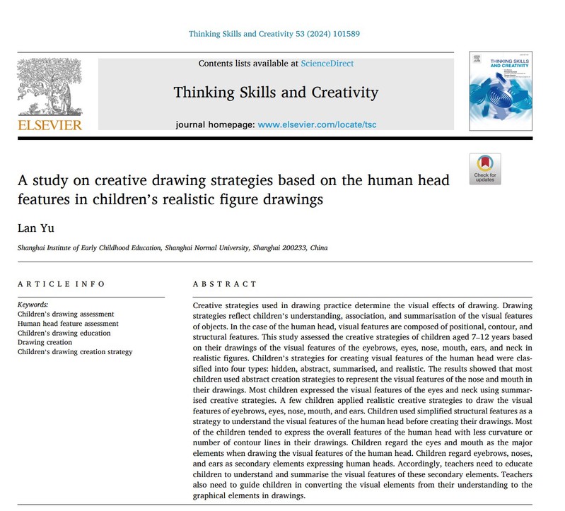 我院于蓝老师撰写的论文"A study on creative drawing strategies based on the human head features in children's realistic figure drawings"发表于《Thinking Skills and Creativity》,该期刊是国际上认可度较高的学术期刊,JCR分区Q1,影响因子为3.5。该期刊提供了一个探索在创造性学习和教学方面的核心议题的平台,同时致力于推动教学方法的创新,鼓励基于理论和实践层面关注创造性思维和技能的研究。
