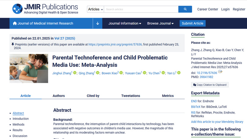 Zhang, J., Zhang, Q.,Xiao, B., Cao, Y., Chen, Y., & Li, Y. (2025). Parental Technoference and Child Problematic Media Use: Meta-Analysis. Journal of Medical Internet Research, 27, e57636. https://doi.org/10.2196/57636