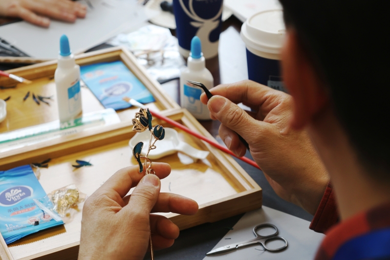 活动由学院工会精心策划,将国家级非遗点翠工艺转化为沉浸式文化课堂。为践行生态理念,染色鹅毛与素雅丝帛替代传统翠羽,既保留了点翠独有的东方色谱,更彰显师者群体的环保担当。老凤祥非遗传承人亲临传授技艺,从剪裁、镶嵌等技法,指导女教工制作点翠胸针、耳环、发簪等饰品。现场氛围热烈而专注,有的老师巧手翻飞,将片片“翠羽”缀成流光溢彩的胸针;有的老师精益求精,笑称“慢工出细活,明日再续匠心”。作品或精致或质朴,皆承载着女性对美的追求与对文化的敬意。活动现场特设茶歇交流区,女教工们品茶畅谈,分享教学心得与生活趣事。