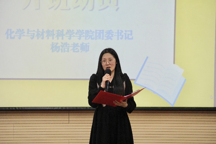 杨浩作开班致辞,她以两院团学组织过去一学期的工作成效为切入点,期望工作人员牢记为同学服务的初心,在团学活动中努力承担起引领青年思想、助力青年成长、繁荣校园文化的使命,进一步推动两院团学工作高质量发展。