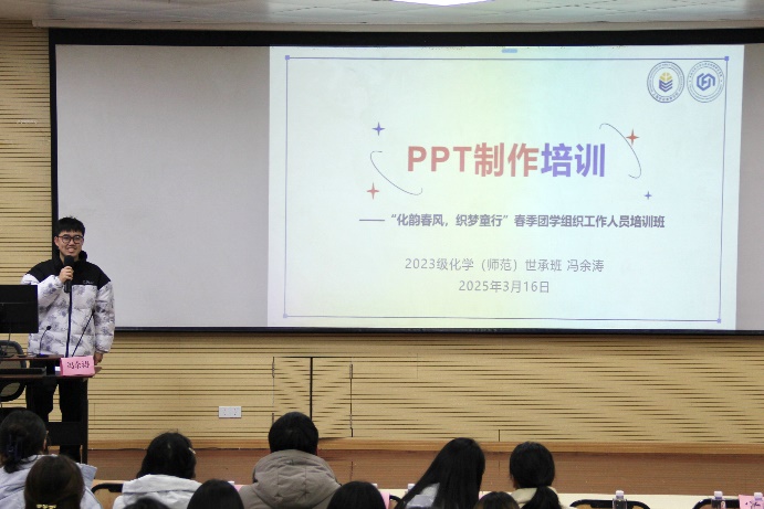 化学与材料科学院团委组织部负责人冯余涛从日常学习与工作着手,分享了PPT制作经验,他表示要在把握内容逻辑的基础上,结合实际场景,打造视觉亮点,在多看多学多模仿中,提升信息检索与日常审美能力。