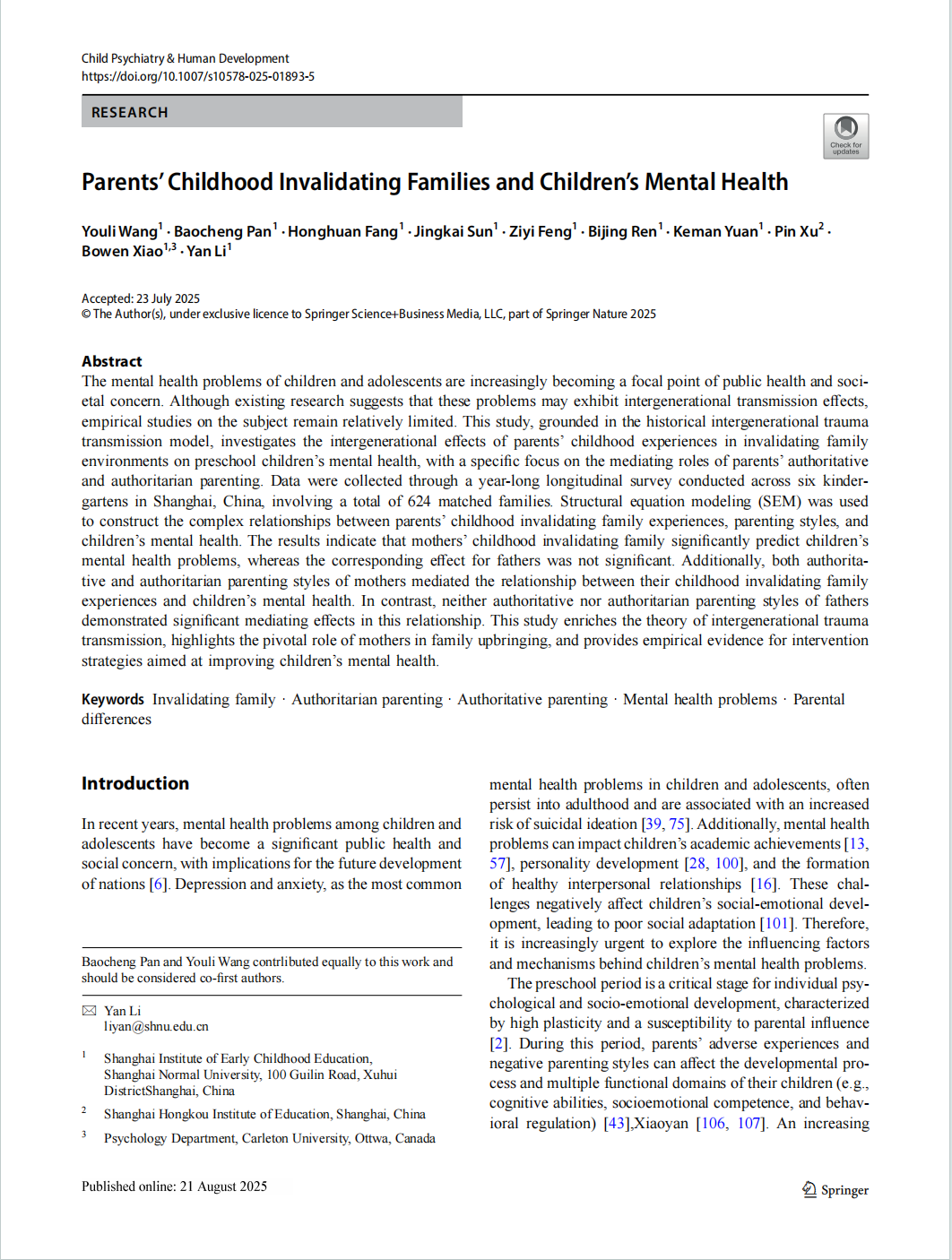 两篇论文均以上海师范大学为第一署名单位,由博士研究生潘宝城、王由丽为共同第一作者,硕士研究生孙镜凯、冯子懿、任碧菁、方虹欢以及博士后袁柯曼,许玭、肖博文等共同参与,李燕教授担任通讯作者。成果发表于 Springer Nature 旗下国际权威期刊,其中 Current Psychology最新影响因子3.3,属 JCR 心理学 Q2 分区;Child Psychiatry & Human Development最新影响因子2.9,属 JCR 心理学/精神病学 Q2 分区。两个期刊均长期关注儿童心理发展、家庭教育与代际传递等前沿议题,具有广泛国际影响力。此次连续发表,充分展示了中国学者在全球家庭教育和儿童发展研究领域的原创性贡献和学术影响力。