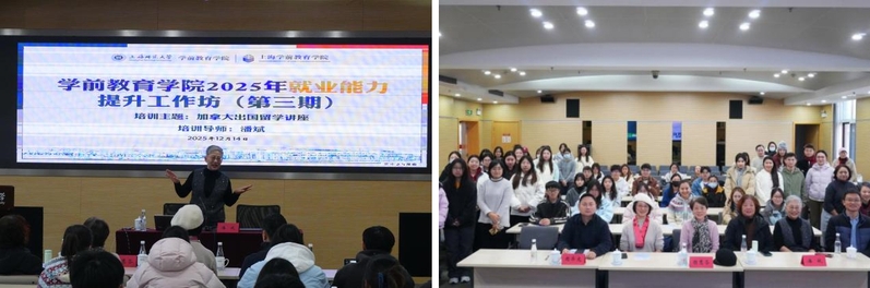 12月14日下午,就业能力提升工作坊第三期活动以出国留学为主题,特邀上海市托幼协会理事潘斌担任主讲嘉宾,上海市托幼协会会长颜慧芬、副会长张佩华等参加活动。潘斌结合自身在国内外从事学前教育研究的丰富经历,客观分析当前学前教育行业面临的机遇与挑战,勉励学子要增强国际视野,拓宽就业路径,她还重点解读了加拿大UBC大学的双本科学位、硕士学位等核心项目,为有学术深造意愿的学子规划合理学历提升路径。