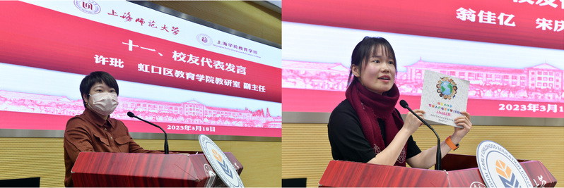2005届校友、虹口区教育学院教研室副主任许玭以及2016届校友、宋庆龄幼儿园翁佳亿分别作校友代表发言。两位校友深情回顾在师大学习生活、奋斗拼搏的足迹,真情感恩母校恩师对他们职业人生道路的帮助和指引,诚挚祝愿母校、母院高质量发展迈向新的篇章。
